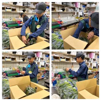 下の写真は、スーパーのバックヤードで売場に並べる前の小松菜の準備をしている様子です。