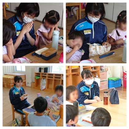 幼稚園ではちょうど、お昼ごはんでした。園児たちと一緒に歌を歌ってから「いただきます」をしています。