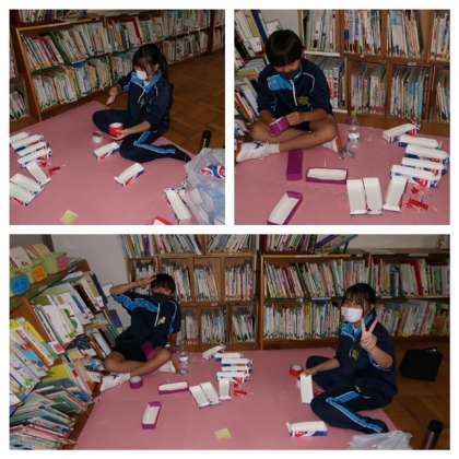 園児がお昼寝をしている間に、園児のおもちゃをいれる箱を牛乳パックで作成しています。