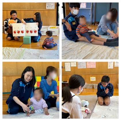 読み聞かせや、自由遊びなど0歳児の親子さんとふれあっています。