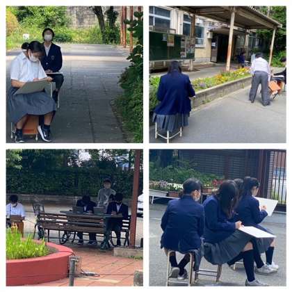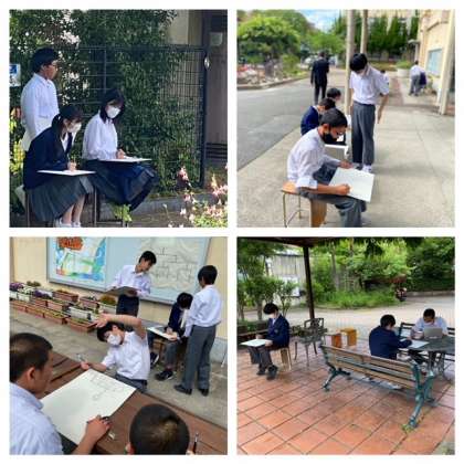 今日は、2年生は各クラスとも外での校内の風景画を描きました。