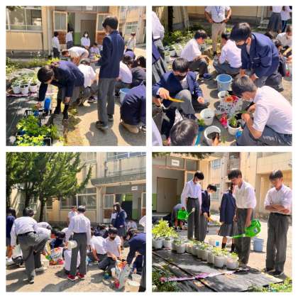 真っ青な空の下、2年生の技術科でトマトの苗を植えました。
