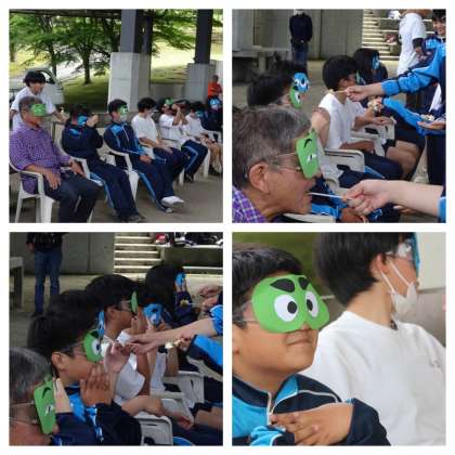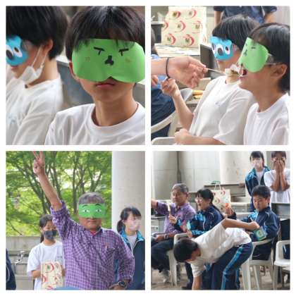 目隠ししての実食です。個性的な目隠しは環境委員が作成しました!