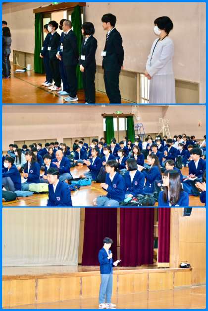 着任式では,学校長のほか計9名が着任し,生徒会長の心温まる歓迎の言葉に新着の教職員の方々も心がだいぶ和んだ気がしたのではないでしょうか。