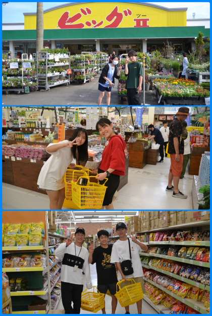 2組最後の訪問先,ビッグツー。奄美を代表する大型スーパーです。ここでお土産を買ったり、明日以降の飲み物を買ったりしました。買い物は旅行の楽しみの一つ。お小遣いの額を考えながら、真剣に何を買おうかと考えていました。ここで、4組と一緒になりました。