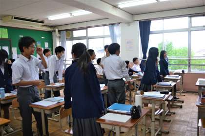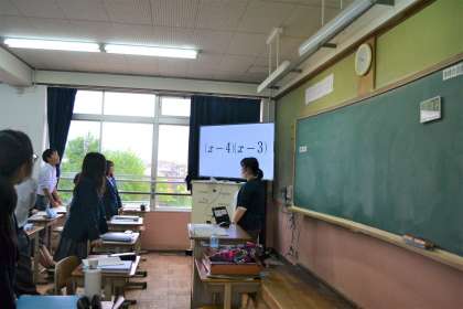 「モニターに映し出された式を展開する」という課題が与えられています。モニターには次から次へと別の式が映し出されます。「公式を覚えてしまえばいい」とは言うものの,数学の苦手な人にとってはそんなに簡単なことではないのかもしれません。この授業では和やかな雰囲気でどんどん答えが返されていました。数学が大の苦手だった私ですが,皆さんはぱっと展開できますか?