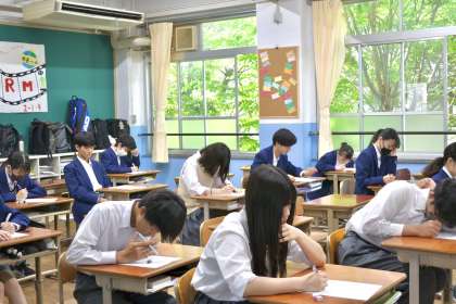 毎週金曜日、朝学活の前の時間を使って「ベーシックテスト」が行われています。週ごとに国語、数学、英語のいずれかの教科から事前に配布された課題について、各自学習し、ベーシックテストを受けます。写真は今日の2年生のベーシックテストの様子です。2組だけ間に合わず、朝学活の写真となってしまいました。「週末です。今日も頑張りましょう!」