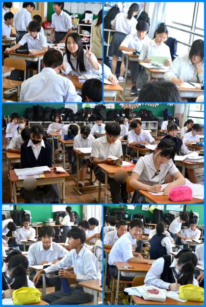 写真はテスト開始約10分前の各教室の様子です。ギリギリまで諦めずに試験範囲を確認する人、カメラに向けてピースをする人、見直しなどは特に何もしない人…様々です。さあ、みんな頑張れ!