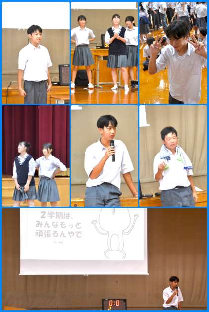 「1学期、お疲れ様でした。2学期はみんなもっと頑張るんやで」という声が聞こえてきそうな写真もあります。クラス議員の皆さん、学年集会の準備や進行お疲れ様でした。