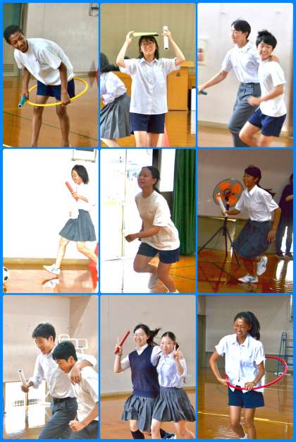 学年集会の様子、最後は3年生です。会場に到着した時にはすでにレクレーションが今にも始まるという状況でした。レクレーションの種目は異種全員リレーとでも言いましょうか、与えられた条件で1週し、バトンを繋いでいくといったものでした。全員が笑顔、かつ真剣な表情を見せていました。修学旅行の時のレクレーションを思い出しました。
