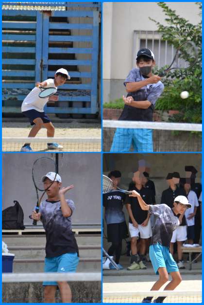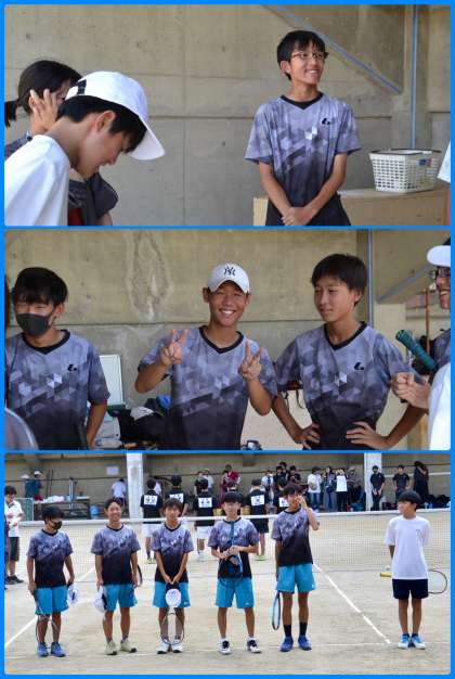 立っているだけで汗が出てくるような強烈な日差しの下、ソフトテニス部の団体戦のブロック予選が加茂川中学校にて行われました。試合前には円陣が組まれ、キャプテンから、気持ちがこもった言葉が述べられ、歌まで飛び出し、勝ちへの雰囲気も高まりました。1本目と2本目の試合が並行して行われ、どちらも押し気味に試合が進みました。一つのペアが勝利し、すぐに3つ目のペアの試合も開始です。