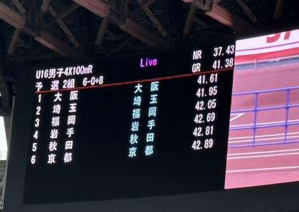 国立競技場で行われている陸連主催「みんなでつなごうリレーフェスティバル」のU16男子4×100mRに本校3年Mさんが京都府代表のアンカーとして出場しました。各都道府県から選ばれた選手が国立に集まり、その中で走るというまたとない経験をしています。観客もいっぱいのようです。すごいことです。