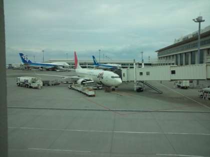 班別研修を終えて搭乗手続きへ。おみやげでいっぱいの荷物を預け、この航空機で関西空港へ帰ります。