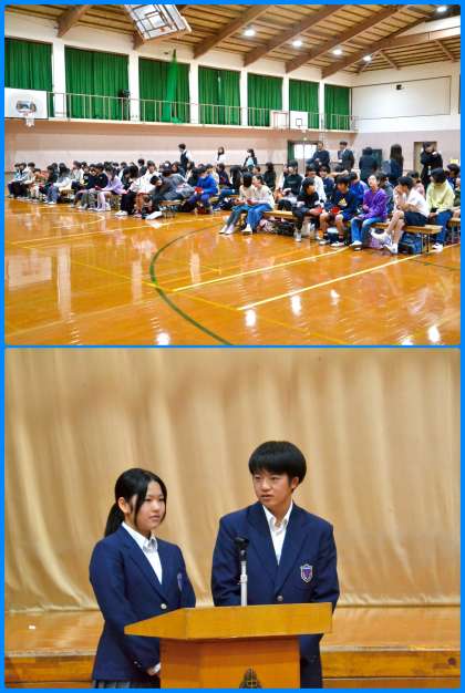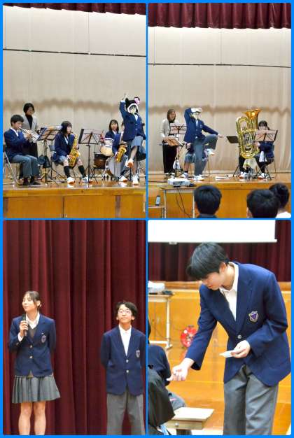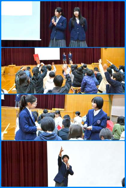 来年度の入学生となる養正・養徳両小学校の6年生を迎えオープンスクールを実施しました。全体での歓迎セレモニーの後、授業体験、部活動体験を行い、入学への不安を少しでも取り除き、安心して入学してもらおうとの取組です。歓迎セレモニーは吹奏楽部の歓迎演奏、生徒会本部による高中クイズと雰囲気を和らげる内容を企画してくれました。クイズに正解するとシールがもらえ、それをカードに貼り、クリスマスカードを仕上げていくといった形で進められました。