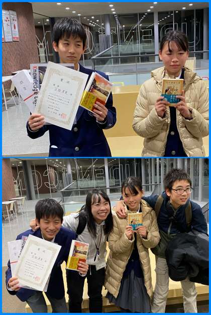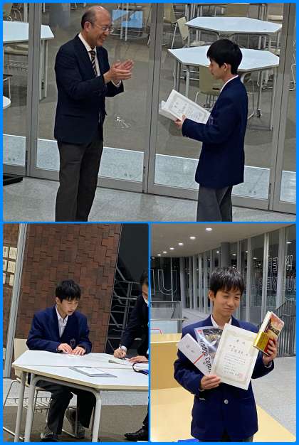決戦会において、予選会とは少し迫り方を変えて臨んだKさんの「八月の御所グラウンド」がチャンプ本に選ばれ、Kさんは3月9日に立命館大学衣笠キャンパスで行われる全国中学ビブリオバトル決勝大会において準決勝からの登場となる言わばシード権を獲得しました。終了後、新聞記者からの取材に応えるKさん。明日の読売新聞の朝刊に掲載される予定だそうです。Kさんおめでとう。Fさんも良いバトルありがとう。二人とも、そして、応援のMさん、さらには学校司書の坪井先生、二人の担任の藤原先生、教頭先生、皆さん本当にお疲れ様でした。楽しい土曜日の午後となりました。