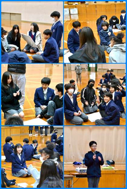 2学期終業式前日、どの学年も集会を行い、2学期の振り返りと、レクレーションを行なっていました。1年生は、クラスの代表による振り返りの発表があり、その後は、1年生の生徒を題材として、「この人は誰でしょうクイズ」が行われていました。寒い体育館ですが、たくさんの笑顔が見られました。