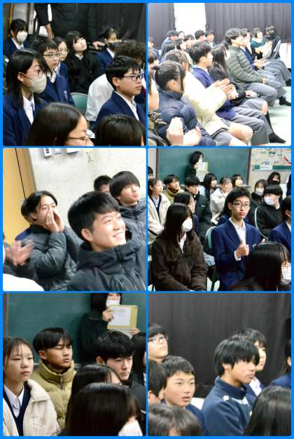 6時間目の後半、2年生は学年集会が行われていました。「今回は何を注意されるのだろう?」といったイメージで会場に入った人もいたと思います。修学旅行についての話であるということは伏せてあったようで、金森先生も焦らしながら話を進めます。修学旅行の行き先の話だと知った時の歓声と拍手。それでも金森先生は簡単には教えません。焦らして焦らして最終的に「九州」と伝えられた時のさらに大きな歓声と拍手。その後の雰囲気の高揚は写真でわかっていただけると思います。今から楽しみであることが皆さんの表情から伝わってきます。