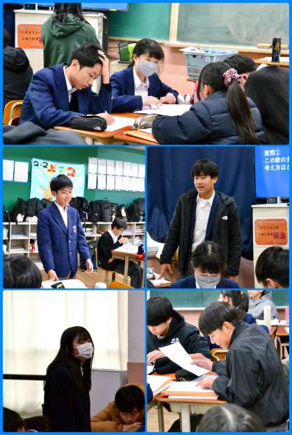 4時間目の2-2の道徳の授業にお邪魔しました。ちょうどグループで意見交流をしているところでした。「優しさって何だと思う?」という問いについて、ある歌の歌詞に出てくる僕の気持ちの変化をもとにして自分なりの答えを見出そうと、言葉を紡ぎながら一生懸命思考する姿がそこにありました。題材も問いも興味深く、みんなが真剣に考えを交流する姿についつい長居をしてしまいました。