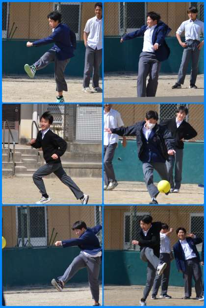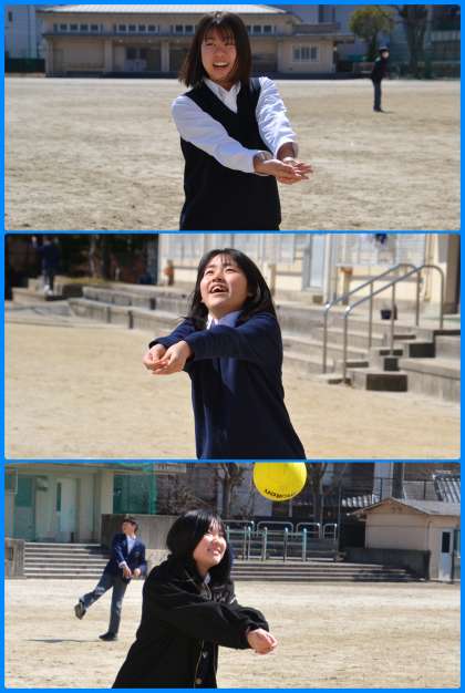 久しぶりの晴れの昼休み。3年生にとっては、明日が最後の昼休みです。♪もうすぐ別の道を歩き、思い出してもくれないの? たまに電車で目と目があってももう制服じゃない♪と歌ったのは荒井由実。あれは「最後の春休み」というタイトルでした。ほんとに最後…そう思うと革靴のまま一緒にパスをしてしまっていました。ありがとう、楽しかったです。