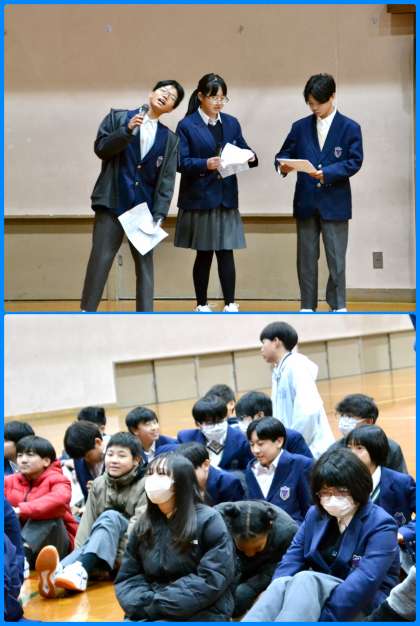 1年生としての最後の学年集会。先生たちの熱い話やスライドショーであっという間の1時間。予定していたレクは2年になってからのお楽しみに取っておくことに。明日で今のクラスも最後です。しっかりと名残を惜しんで下さい。