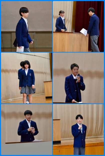 認証状が手渡された後、クラス議員の代表の3年生Nさんが決意を述べてくれました。それを受けて、生徒会長の激励の言葉と続きます。多くの生徒たちがその二人の話をしっかり聞いている様子を見ると、ますます期待が膨らんできます。委員の人たち、それをサポートする生徒会員のみなさん、皆さんの力で高野中を輝かせて下さい。