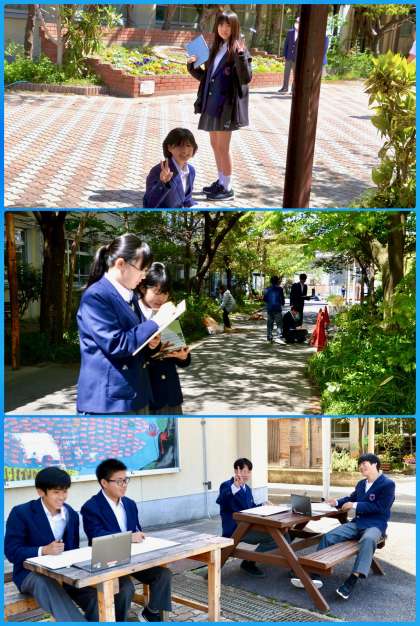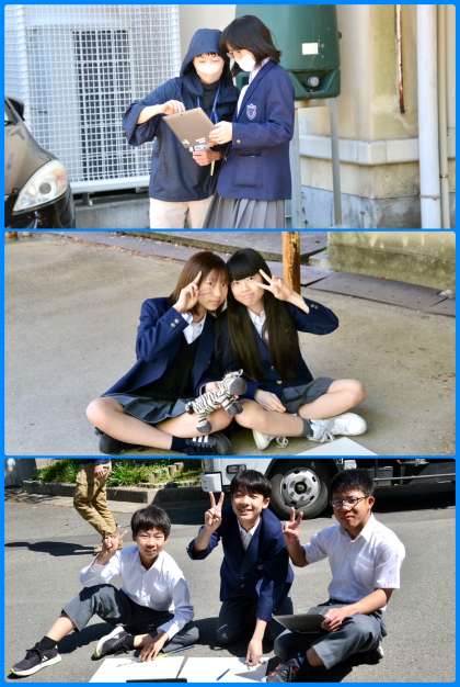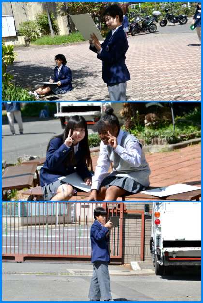 2時間目、2ー3の美術が中庭等で行われていました。今後、雨が降って外で作品制作ができない場合に備え、 GIGA端末で撮影しておくようです。今日は最高の天気。この光加減は端末に保存できないのでは?