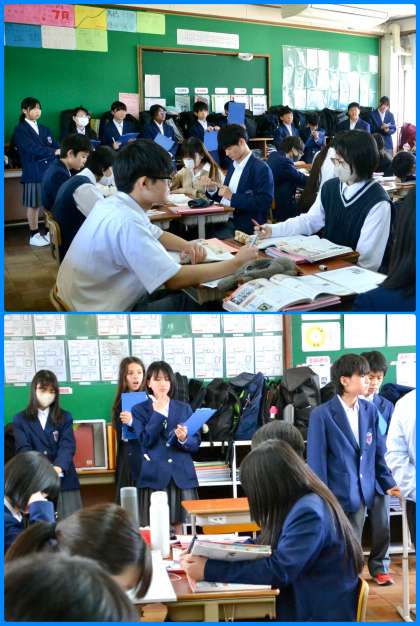 1-2は2時間目、1-3は4時間目に3年生の授業見学を行いました。先生の話を聞いて問題を解くといったものではなく、自分たちが作り上げる授業に向け、3年生の授業を参考にさせてもらおうとのねらいです。どちらも授業の前半を参観させていただきました。特に、グループでの活動は参考になればいいですね。