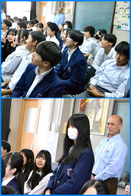 「バスケに打ち込み、勉強はあまりせずという中高生時代。特別でも何でもなく、好きなことしかしないといった人物。やりたいことがあったら、それを言葉にして伝えるようにしている。言霊とでもいうのか、そうすることによって周りの人が繋いでくれることも多い。やってみたいと思っていたことも、何か違うということもあり、それはやってみないことにはわからない。やりたいことが見つからないという人も多いかもしれないけど、その場合は、自分の周りの誰かを喜ばそうというようなところから初めてみてはどうだろう。」と3年生に語りかけていただきました。将来のことを考えたり、何かを始める際に中高生が抱きがちな思いを汲み取った内容の話をしていただき、3年生が目をキラキラさせて聴いていたのがとっても印象的でした。村岡様、遠方より来ていただきありがとうございました。あっという間の1時間でした。