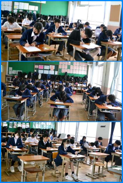 毎週金曜日の朝学活前に事前に提示された漢字や計算について確認のテストを行っています。今日は、1・3年生は漢字、2年生は計算問題に取り組んでいました。他クラスとの競い合い的な要素も取り入れながら1年間継続して取り組んでいきます。