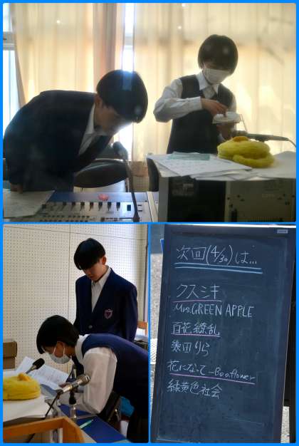 お昼の校内放送「高中ラジオ」を放送している時の様子です。今朝の3択リクエストのうち、1番票が多かったのは、「クスシキ」(MRS. GREEN APPLE)でした。「Let’s start 高中ラジオ!」とのオープニングコールに続き、委員会活動関係の情報が伝えられた後、「それでは、曲をお楽しみください」とアナウンスがされていました。