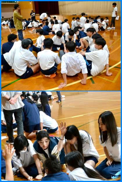 体育祭の取組がすでに始まっています。3年生以外は、クラスの枠を離れて、3つの色に分かれて競い合います。2年生は、今日、誰がどの競技に出場するかを色ごとに分かれて決めていました。
