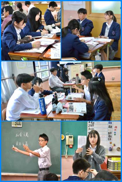 今日は3-2の社会の授業を参観しました。「過剰生産に端を発した世界恐慌において、旧ソ連がその影響を受けなかったのはなぜ?」という問いが出されていました。一昔前なら、「1929年に世界恐慌が起こった」といったことを先生が説明をするような授業だったのが、今は、既習事項から自分で考え、他者と意見交流をし、そこから自分の考えを再構築するような授業が求められています。先生の説明を聞くだけの授業には見られない、生き生きと自分の考えを述べる姿が随所に見られました。