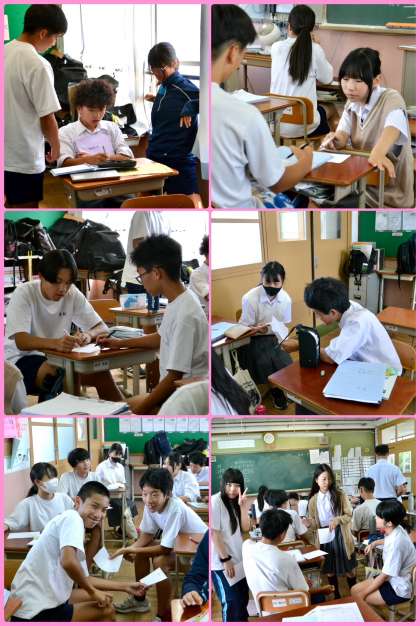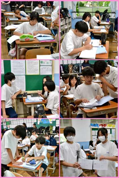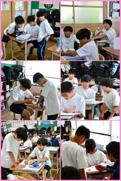 昨日に続き5時間目の様子を掲載致します。今日は、1-2、2-2、3-4の様子です。期せずして3学年とも数学の授業でした。考え、他者に説明する…単に得意な子が苦手な子に解き方を教えるといったものではない学び合う姿が多く見られました。