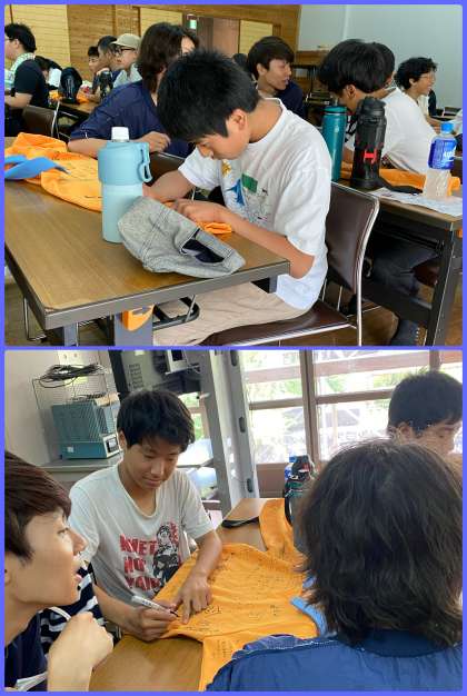 ウォークラリーを終え、この2日間お世話になった学生ボランティア着用のトレーナーにメッセージを書いています。ボランティアの皆さんのおかげで楽しい時間を過ごすことができました。