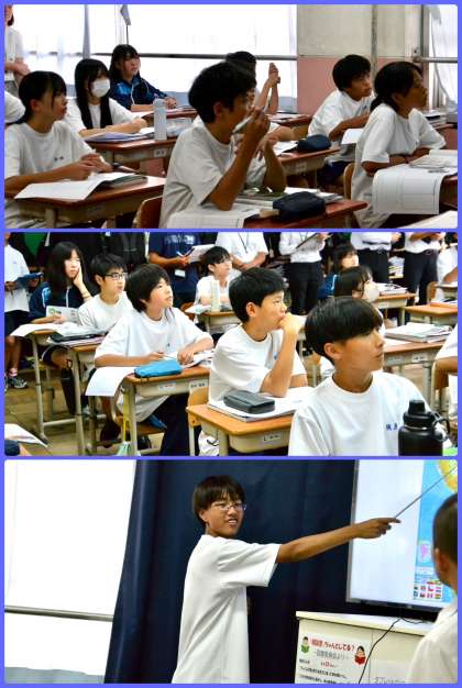 各学年1クラスずつに協力してもらい、6時間目に授業研修会を実施しました。研究授業のないクラスは下校でしたが、CLO の生徒の皆さんには授業を参観してもらい、生徒目線から、授業の感想や意見を言ってもらいました。生徒の「問い」を取り上げ、自分の意見を他者に聞いてもらったり、他者の意見を聞いたりする授業が展開され、主体的で対話的な授業づくりに向け、さらなる改善に挑んだ授業研修会でした。