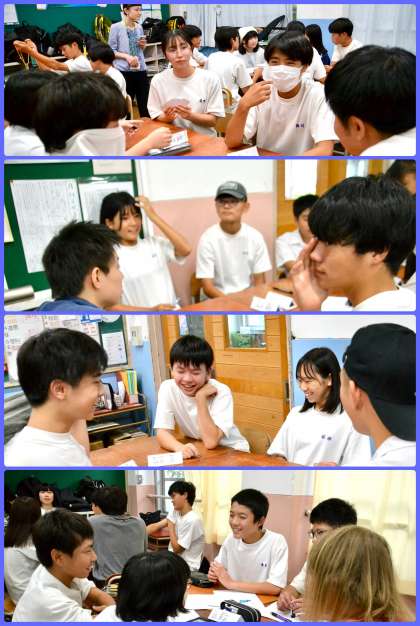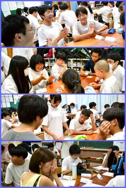5・6時間目、2年生は、様々な国や民族の文化・伝統・生活様式を知り、そこで生まれ育った人々の価値観を共有することで、一人ひとりが共存できる国際社会を築くために大切なことは何なのかを考えることをねらい、京都文化日本語学校の留学生を招いて学習を行いました。前半は留学生が、自国と日本との違いなどを話してくれました。後半は日本らしい遊びなどを留学生と一緒にするなどして交流を深める時間としました。人種の枠を越え、人権を尊重する姿勢を養うステップになればと思います。