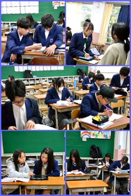 今日が期末テスト1週間前。今日から部活動も停止となり、テストに向けて学習に集中する1週間となります。放課後学習も実施され、全体の雰囲気がテストモードに入ってきたような感じです。各学年の放課後学習の様子です。
