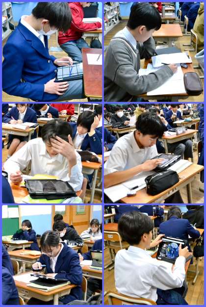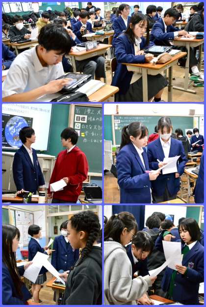 本年度は年度当初から授業改善のための研修及び授業実践に精力的に取り組んでおります。教員がグループを作り、事前の検討会で意見を出し合ったことを授業で実践し、振り返りを行うというサイクルを繰り返し取り組んでいます。今日は、2-2の理科の授業において実践がされました。生徒の様々な反応を想定して臨んだ授業でしたが、学びが深まったでしょうか。