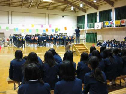 3月13日、お世話になった3年生に感謝の気持ちを伝えるために「“卒業”それは別れではなく新たな世界への挑戦状なんだ」というテーマのもと、3年生を送る会が開かれました。生徒会のオープニングにはじまり、1、2年生からは気持ちのこもった歌などのプレゼントが贈られました。学年全体で企画し、一生懸命取り組んだ練習の成果を3年生は真剣に聞いてくれました。思い出ビデオでは、大歓声と大爆笑が交互に起こりました。過去の自分と比べると、大きく成長したことがわかりましたね。3年生からは後輩へ向けて歌のプレゼント。特別な時間を過ごしたこの高野中学校への「ありがとう」という気持ちが溢れていたように思います。最後には、高中3ピース宣言を全校生徒で大合唱。会場全体がみんなの歌声で包まれました。