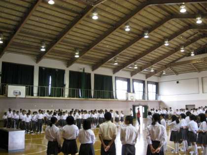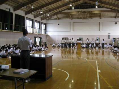 6月18日(火)体育館で生徒会の重要な行事である「生徒大会」をしました。まず,学年ごとに学級目標と学級旗の発表があり,学級で討議されたことについて質疑応答がありました。生徒会を中心に全生徒が参加するよい大会になりました。最後に,全員で「高中3ピース宣言」を歌って終わりました。本部役員,クラス議員のみなさん,お疲れ様でした。