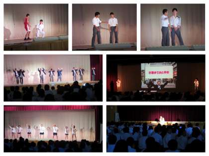吹奏楽部の演奏では,夏のコンクールで銀賞を得た曲から始まり,みんながノリノリになるような曲の演奏が聴けました。アンコールでは,特別ゲストとして何人かの先生達が舞台に上がり,吹奏楽部の演奏に合わせて歌と踊りを披露しました。