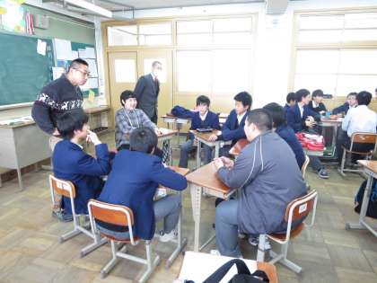 1月22日(水)の6時間目,3年生は各クラス5人,合計15人の留学生に協力をいただき国際理解学習をしました。京都文化日本語学校で学んでいる韓国,台湾,タイ,インド,イタリア,フランス,アメリカからの留学生のみなさんに,各クラス5つに分かれたグループで1人ずつスピーチをしてもらい,生徒達が質問をする形で交流をしました。留学生はパソコンやスマートフォンを利用して母国の写真を紹介するなど楽しい交流ができました。