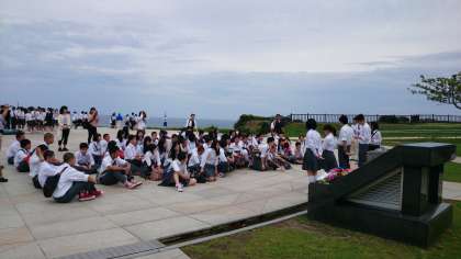 平和の礎で修学旅行委員が中心になり平和セレモニーを行いました。みんなで折った千羽鶴を奉納し、平和を祈って黙祷をしました。クラス写真を撮って、いよいよ読谷村へ向けて移動開始です。