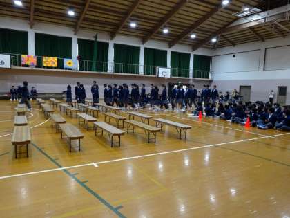 3月9日(水)5,6限、3年生を送る会が行われました。温かい拍手に迎えられ、3年生が入場し校歌斉唱をした後、生徒会本部によるオープニング、1,2年生からのそれぞれの贈り物、各クラブからのメッセージ、ビデオ上映、3年生より、エンディング の順にプログラムが進みました。どのプログラムも3年生を送る気持ちがこもった発表で、きらりと光るとても素敵な企画でした。最後に「高中3ピース宣言」を全員で歌い、すばらしいハーモニーを響かせ、送る会を終えました。