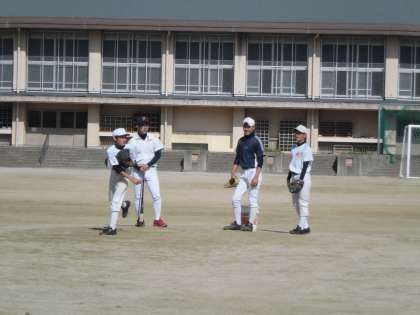 昨日18日(月)は入部届の提出締切日でした。入部届を提出した生徒は,今日から部員として活動しています。高野中には,10の運動部と3つの文化部の合計13の部活動があります。文部科学省は,運動部活動の意義を,「学校教育活動の一環として,スポーツに興味と関心を持つ同好の児童生徒が,教員等の指導の下に,自発的・自主的にスポーツを行うものであり,より高い水準の技能や記録に挑戦する中で,スポーツの楽しさや喜びを味わい,学校生活に豊かさをもたらす意義を有している。」としています。写真にあるのは,野球部の活動の様子です。1年生を含む部員たちがベースランニングや次の塁(ベース)に向けてスタートを切るタイミングについて,顧問の教師からアドバイスを受けているところです。 "Practice makes perfect"です。