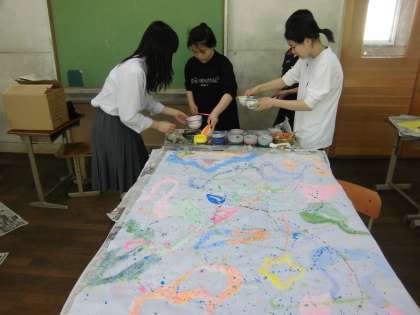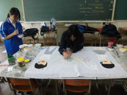 他の教室では,2年生の生徒たちが学級旗を作っています。クラスでデザインを考え,いよいよ着色開始です。どの学級も心を込めて作っています。完成した学級旗は,体育祭,3年生を送る会等の行事で使います。普段から教室に掲示している学級もあります。