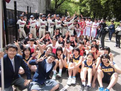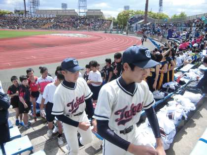 春季総合体育大会開会式に参加する生徒たちは,バス2台に分乗し西京極陸上競技場に到着しました。スタンドに荷物を置き,待機場所に移動しました。生徒たちはリラックスしています。