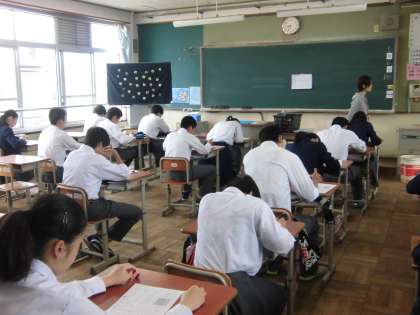 8:30〜8:40まで,ベーシックテストが行われています。ベーシックテストとは,基礎・基本の定着,自主的に学習する力の育成,学習習慣を身に着けることを目的に,以前から行われている,高野中学校独自の取り組みです。ベーシックテスト前には,家庭学習プリントで学習を進めます。目標点に達しなかった場合は,翌週水曜日に開催される学習会に参加し,目標達成を目指します。今回は,1年生国語,2年生数学,3年生英語が行われいています。