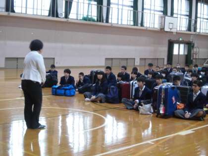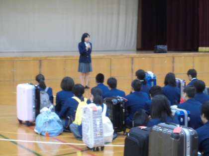 3年生は,7:45から体育館で結団式に臨みました。もちろん司会は,修学旅行委員が行います。校長先生のあいさつ,修学旅行委員長あいさつ,添乗員さんとカメラマンさんの紹介,委員の生徒による諸注意などがありました。和やかな雰囲気の中にも少し緊張していることがわかります。