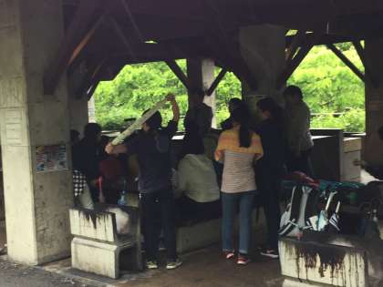 雨が降り出しました。片づけを終え,バスに乗り込み京都に向かいます。